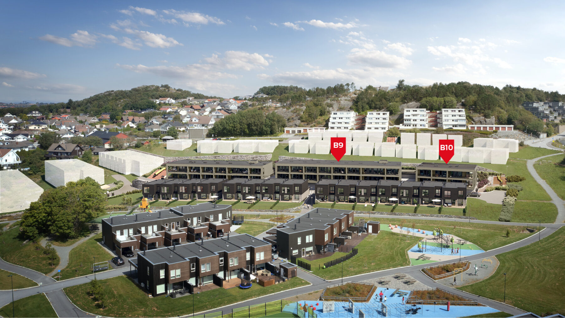Blokkene går over tre etasjer. I B10 som lanseres innen mars 2026 er det seks, i B9 er det seksten. I underetasjen finner du parkeringsplassen og sportsboden din. Det er tilrettelagt for elbil-lading. Gjester kan parkere både i p-kjeller og utvendig langs vei. Tunge handleposer er ikke noe problem: Du tar bare heisen.