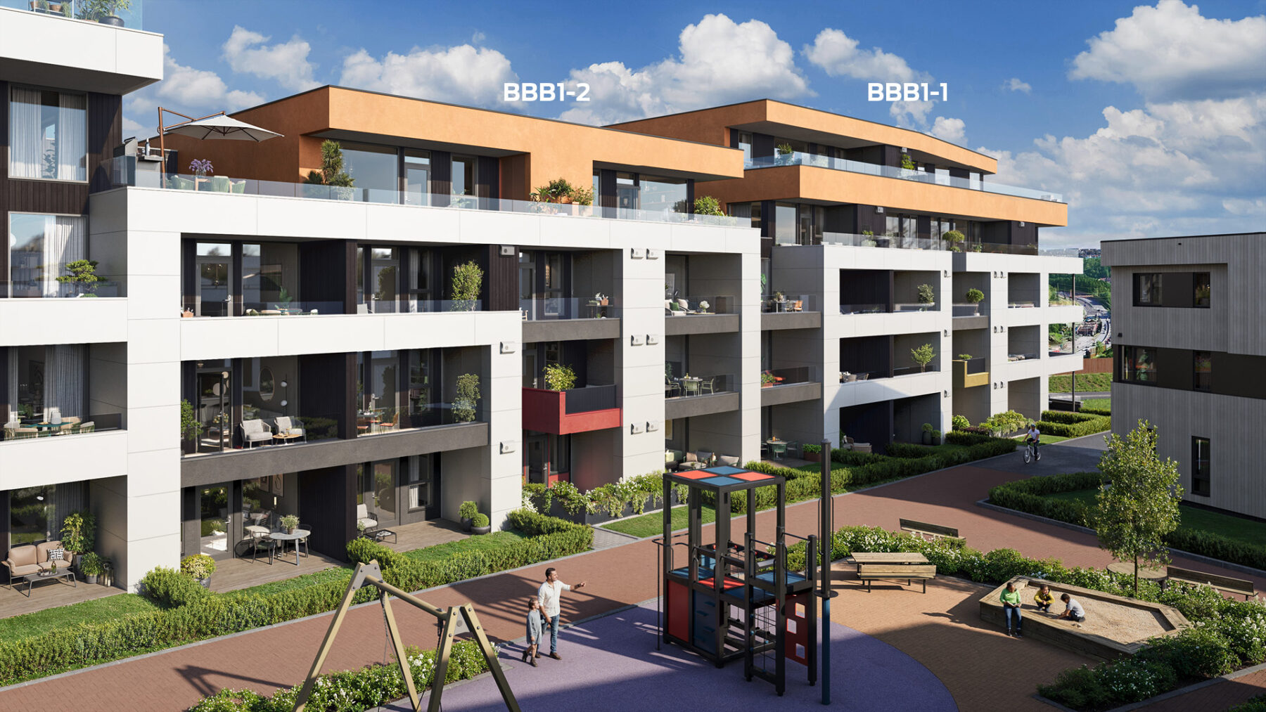 BBB1-1 ligger lengst sør av de to blokkene. Denne blokka har 22 leiligheter over 5 etasjer. Felles for alle leilighetene er at stua og kjøkkenet er bygget i en åpen løsning mot vest. Soverom og bad ligger for det meste i andre enden, med noen variasjoner. Velger du deg første etasje, får du en vestvendt terrasse med utgang fra stua. Ett hederlig unntak: Leilighet 3 – den har terrassen mot sør. Går du for en av de andre etasjene, er det balkong som gjelder – også disse vendt mot vest.