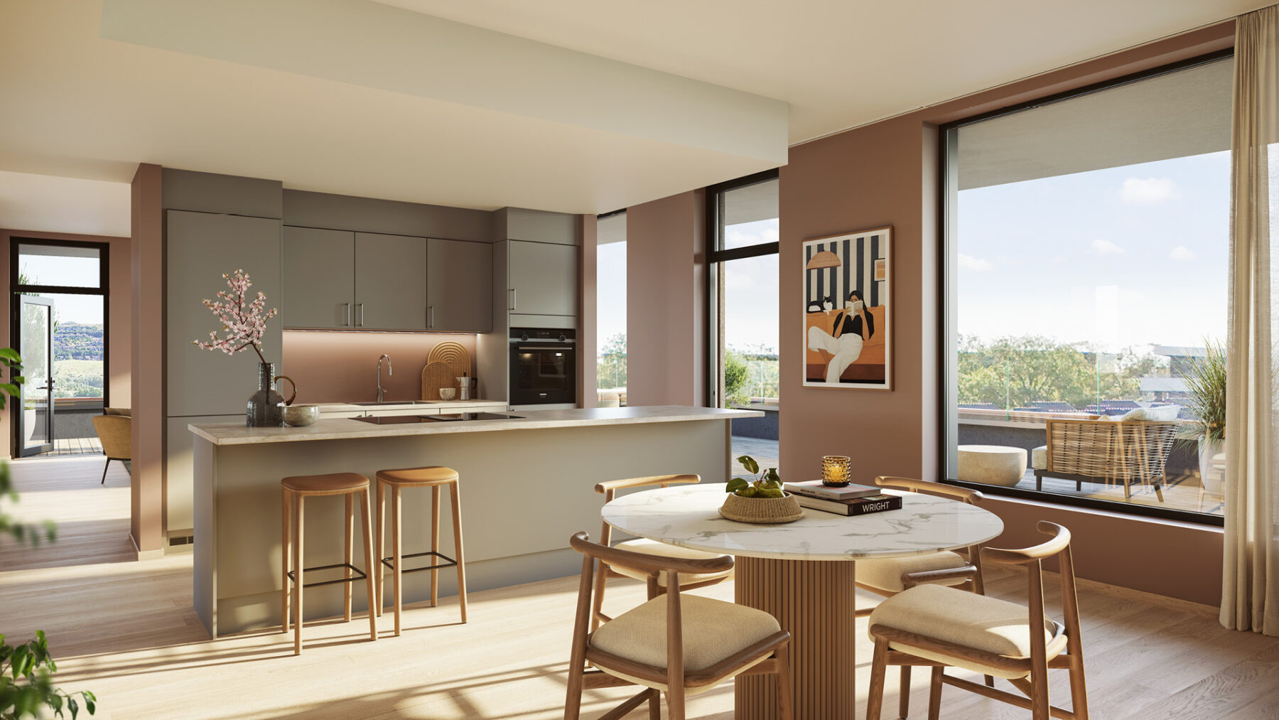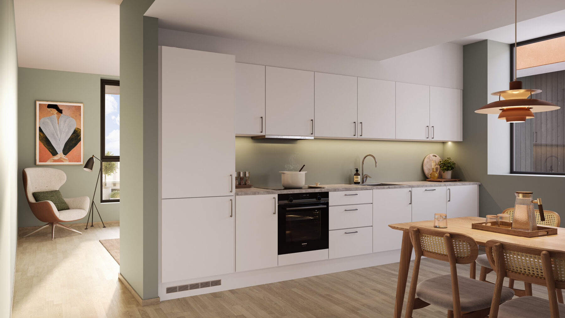 Begge blokkene har kun to leiligheter i øverste etasje. Disse er de fire største leilighetene på delfeltet, fra 97 kvadrat og helt opp til 137. Her kan du velge deg en balkong på hele 95 kvadrat, et praktisk grovkjøkken, eller kanskje det er et godt hjemmekontor du har mest bruk for? Kjøkkenet leveres med integrerte hvitevarer, og du kan velge mellom flere farger på frontene. Deilig vannbåren varme i gulvet på kjøkkenet og i stua. På gulvet i alle tørre rom får du 1-stavs hvitpigmentert eikeparkett.