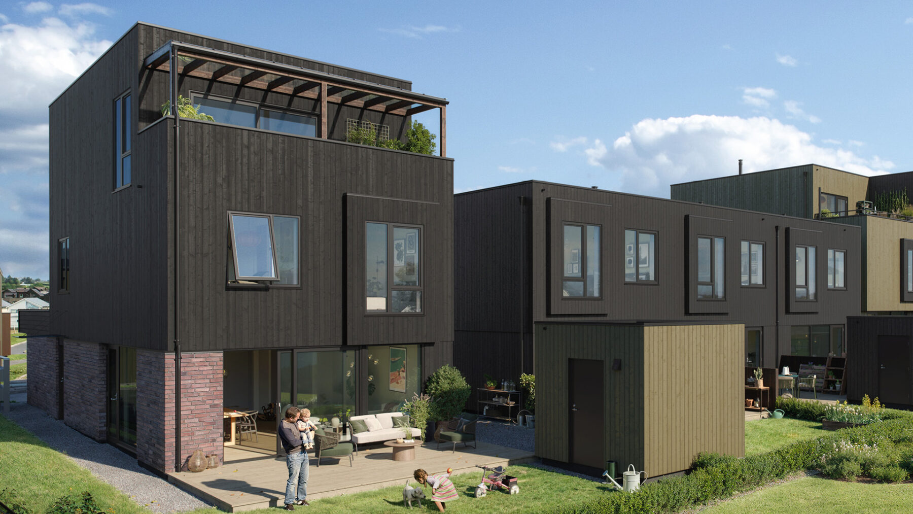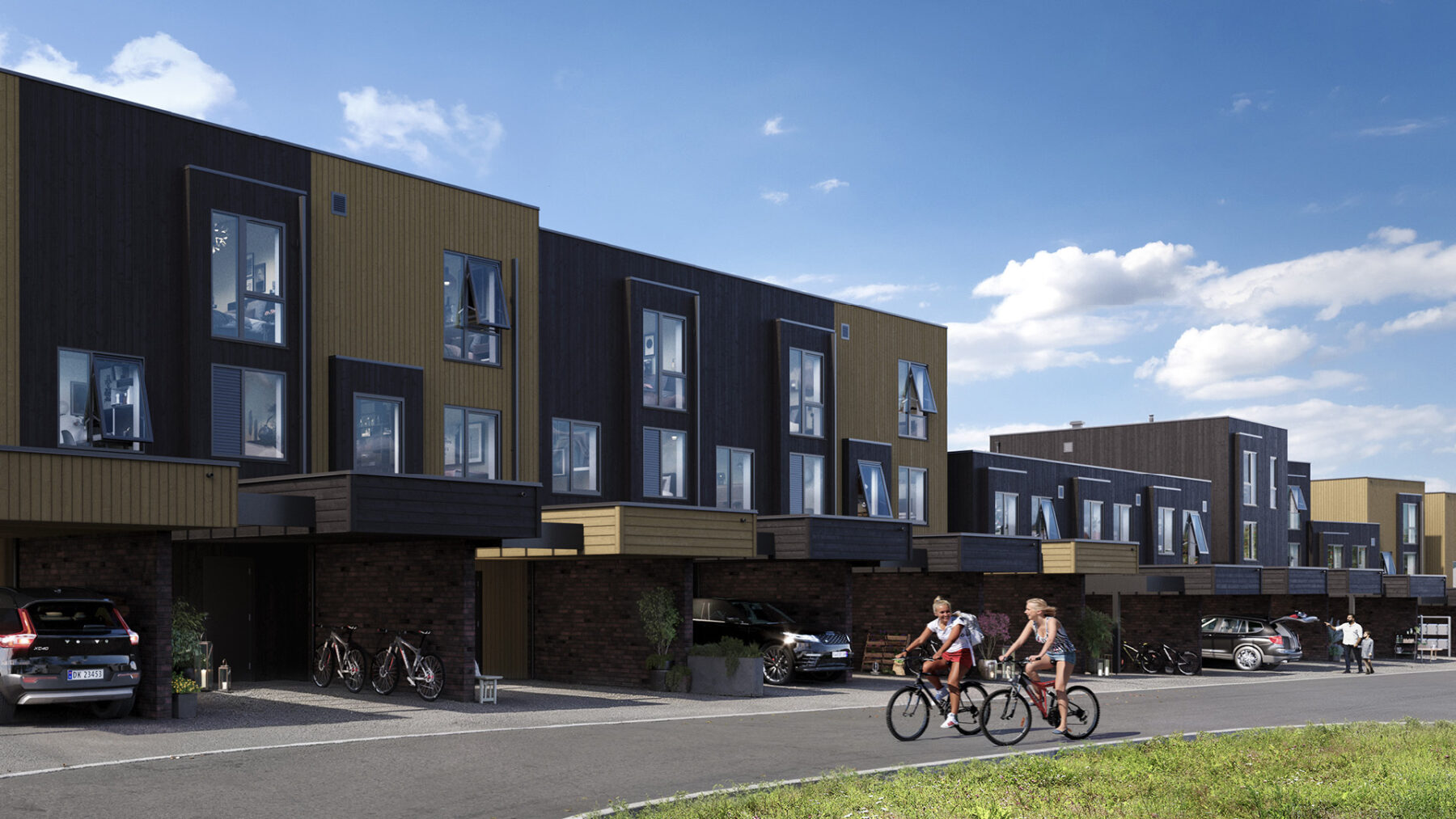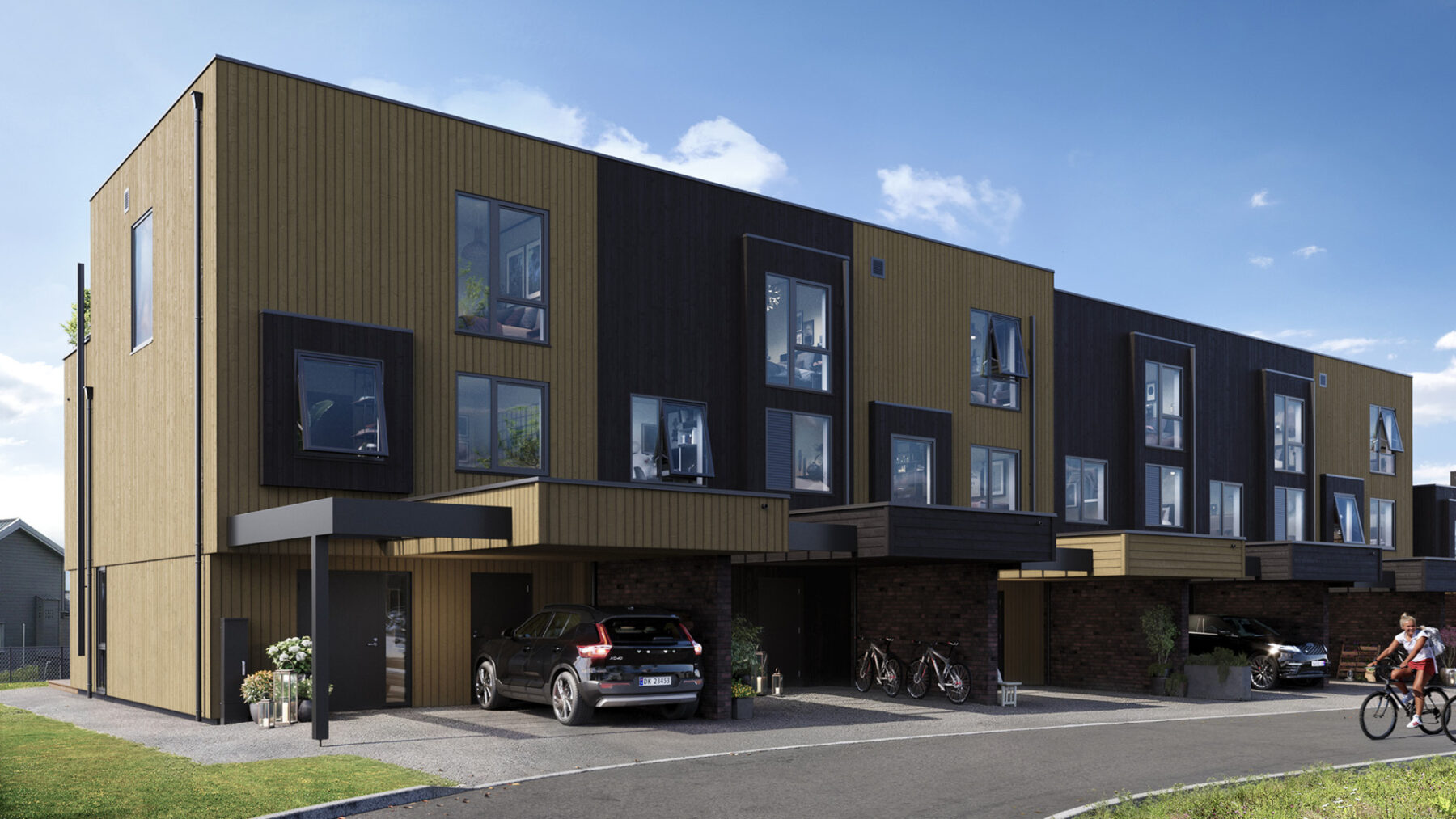 Forskjellige boligstørrelser og fasadeløsninger skaper dynamikk i arkitekturen. I delfeltet er det hus både i to og tre etasjer. Noen av de større boligene har inntrukket takterrasse. I sum gir dette en fin variasjon i uttrykket. Alle boligene har fasaden med inngangsparti, forskjønnet med pergola, mot nordøst. Utenfor står carport og en bodløsning i litt ulike varianter. Vi legger belegningsstein i gardsrommet, mens det på hagesiden er singel der du skal bygge terrasse og maskinplanert jord der du skal anlegge hage. Bare å glede seg!